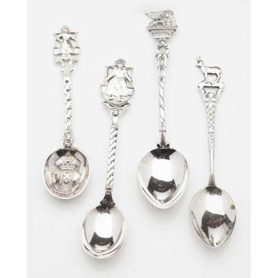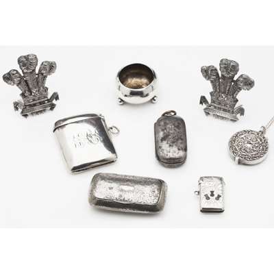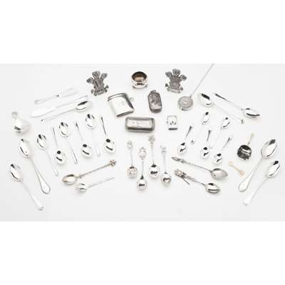 various makers and marks, to include, a case of six silver teaspoons; a case of five silver teaspoons; eight miscellaneous teaspoons; two vesta cases of varying sizes; a pewter snuff box; a sovereign and half sovereign case; one pocket magnifying glass on chain; a mustard bowl; two menu holders; a collection of unmarked twisted handle teaspoons; a caddy spoon; two knives; ivory spoon together with a Mappin & Webb, a commemorative caddy spoon for Queen Elizabeth II's Silver Jubilee (qty)