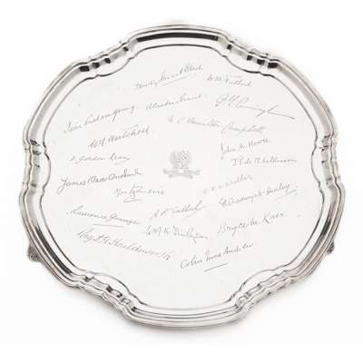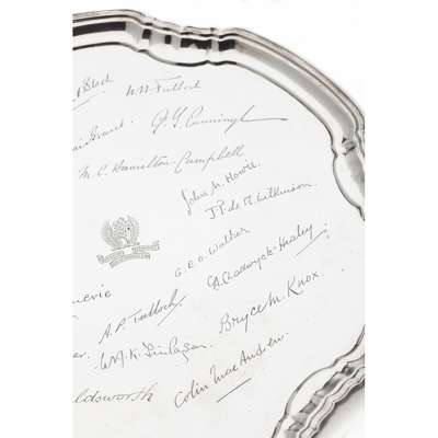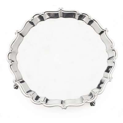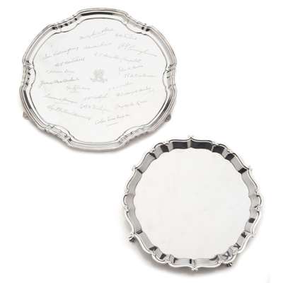 R & W Sorley, Glasgow 1917, moulded scroll border, raised on four paw feet, together with another larger salver, of shaped circular form, moulded border, raised on three bracket feet, presentation engraving to front (2)