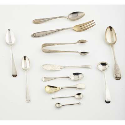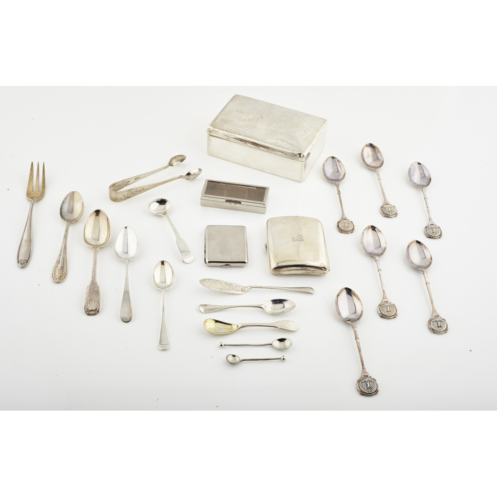 to include; a table cigarette case, plain; a curved pocket cigarette case; a white metal match case and a similar three division stamp case; a collection of miscellaneous teaspoons, various dates and makers (qty)
