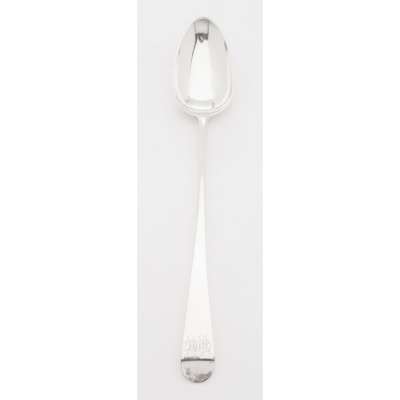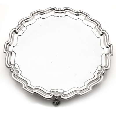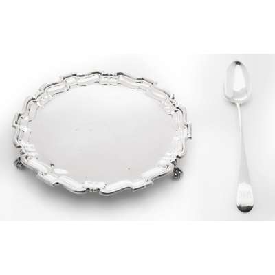 Harrods Stores Ltd (Richard Burbridge), 1914, with pie crust edge, raised on four scroll feet, together with a George III serving spoon, Stephen Adams II, 1776 (2)
