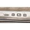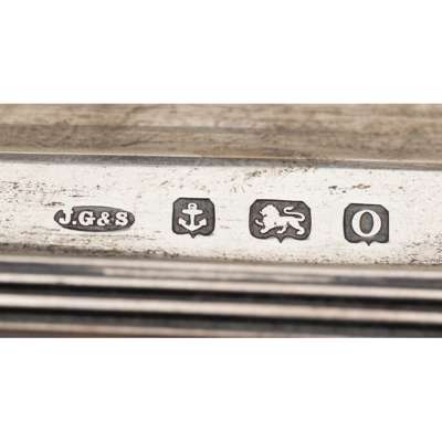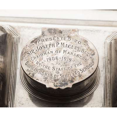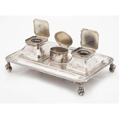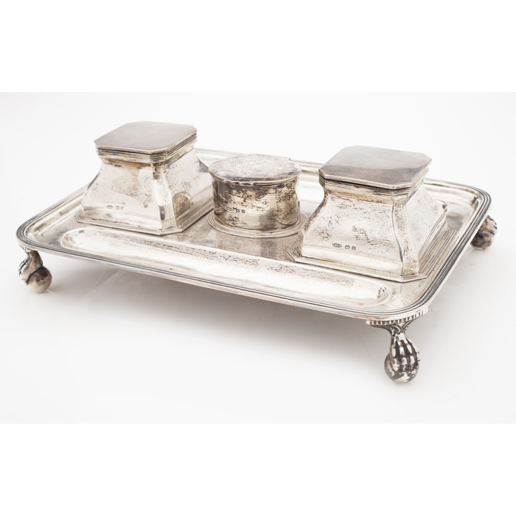 John Grinsell & Sons, Birmingham 1913, the rectangular base with two deep pen trays, two square with canted corner ink wells and central oval compartment inscribed with presentation details all raised on four ball and claw feet, presented in a blue velvet case