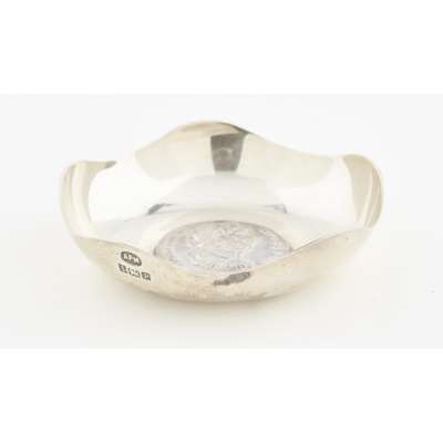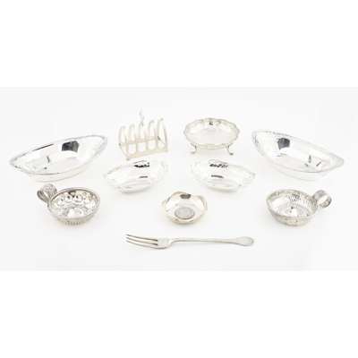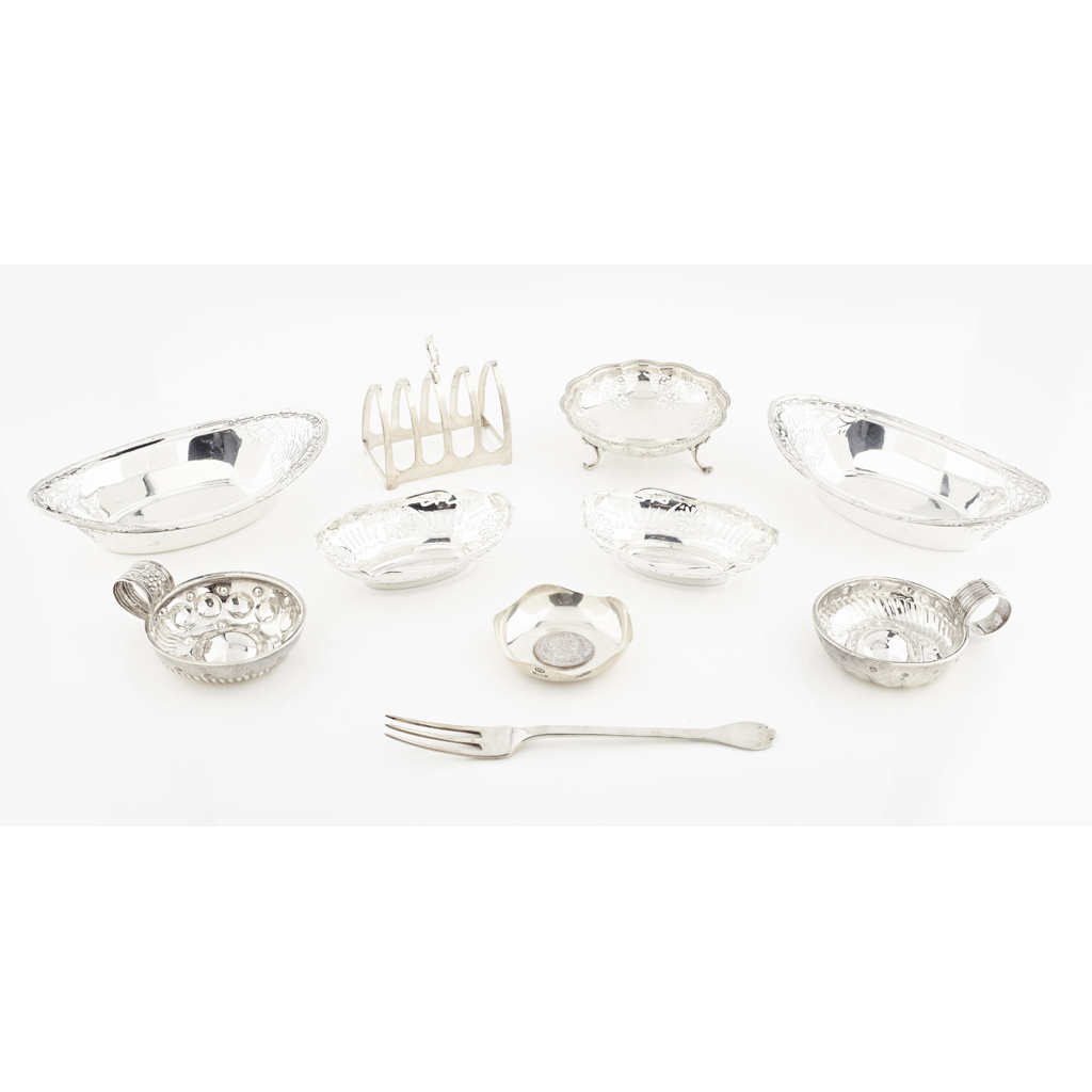 to include, a pair of bon-bon dishes, Goldsmiths, 1905, a similar smaller pair, Charles S Green & Co Ltd, Birmingham 1921; a pin tray, APM, Birmingham 1989; a small sweetmeat dish, William Suckling Ltd, Birmingham 1939, two unmarked wine tasters; a three prong fork, indistinct marks; a toast rack, Viners Ltd, Sheffield 1933 (10)