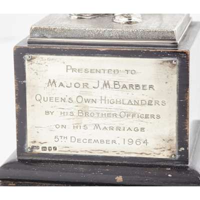 Carrington & Co, London 1961, surmounting a wooden plinth, a plaque celebrates the marriage of Captain C.M. Barber wearing number 1 ceremonial parade dress