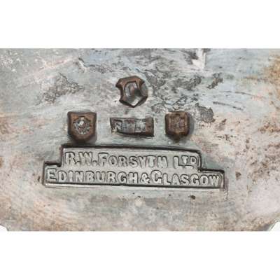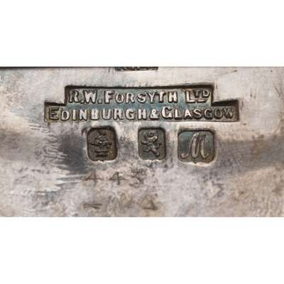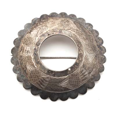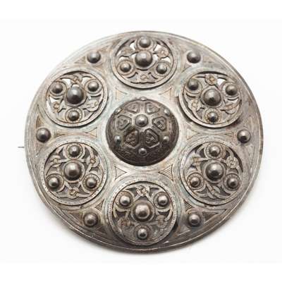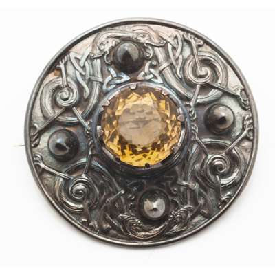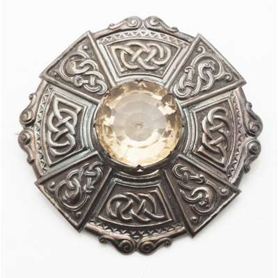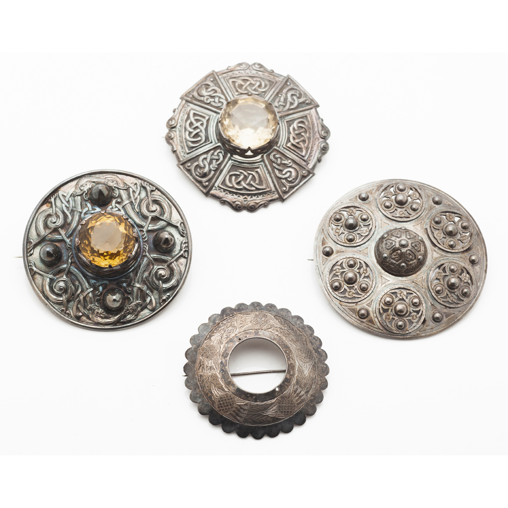 Henry Tatton, Edinburgh 1910, of circular outline with cast Celtic knot work panels and bosses, claw set citrine to centre; another similar, R W Forsyth Ltd, Edinburgh, 1908 together with an embossed brooch, R W Forsyth Ltd, Glasgow, 1909; and an unmarked part brooch (4)