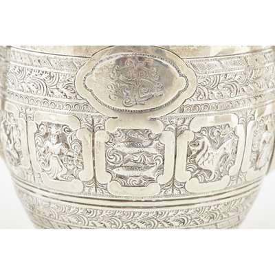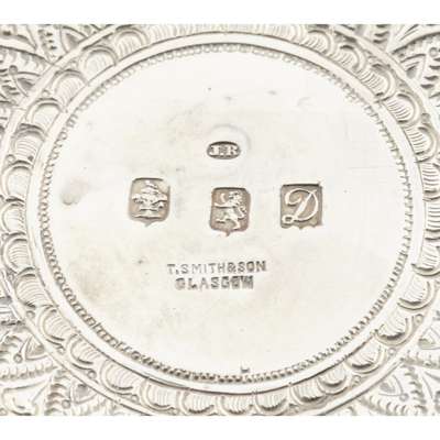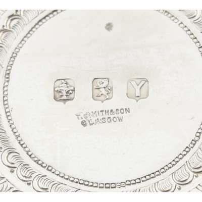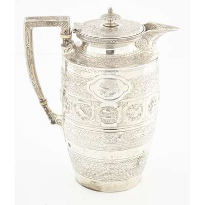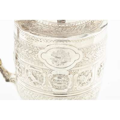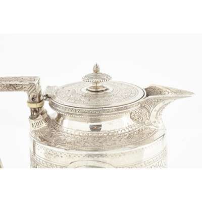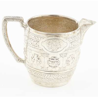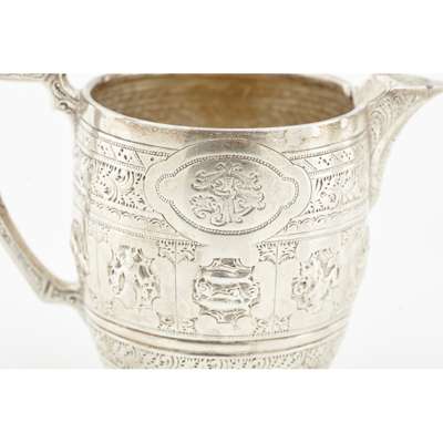 James Reid & Co, Glasgow 1900, retailed by T Smith and Son, comprising teapot, water pot, sugar bowl, milk jug, all of tapered form, angular handles, heavily chased all over with astrological designs (4)