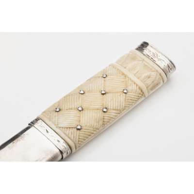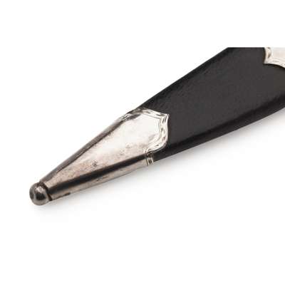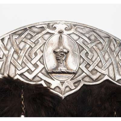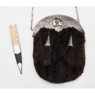 cantle marked for Thomas Ross & Sons, Glasgow 1891 with Celtic knotwork and applied crest to centre, fur purse with two tassels, with belt and chain; together with a sgian dubh, single edged blade, the basket weave carved ivory hilt studded with eight studs, foil backed quartz pommel (2)