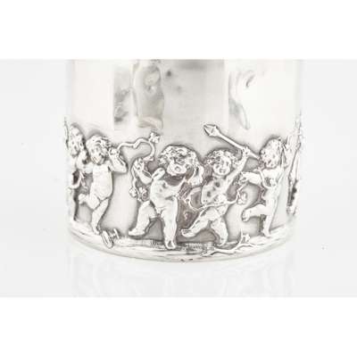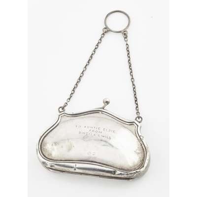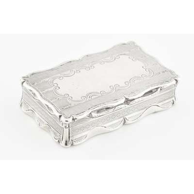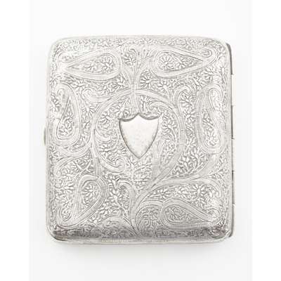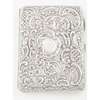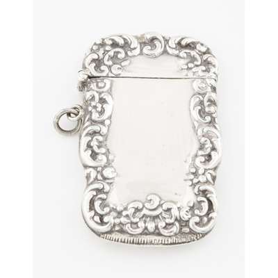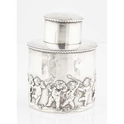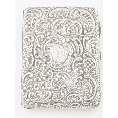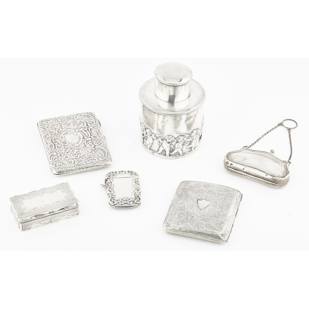 indistinct maker, Birmingham 1901, of cyclindrical form, cherubic figures embossed to body, pull off top; together with, a snuff box, Edward Smith, Birmingham 1850; an ornate wallet, Birmingham 1898 with leather inset, ivory tableau; a silver purse, S & Co, Birmingham 1913; a white metal Eastern case; a vesta case marked STERLING 925 (6)