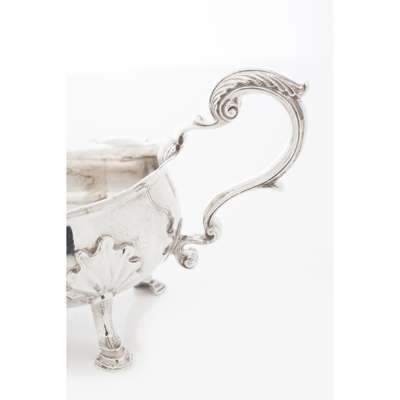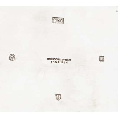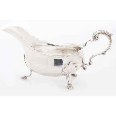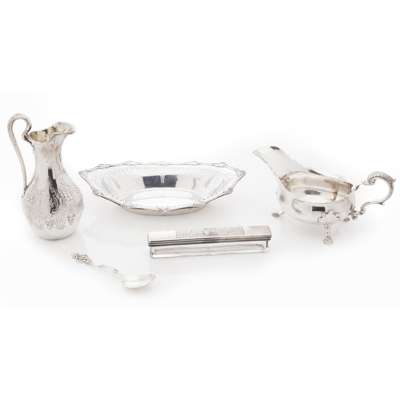 to include; a sauce boat, Walter & John Barnard, 1879, a Norwegian style spoon, a dressing table box, George Reid, 1839; a jug, Robert Gray, Edinburgh 1877; a bon-bon dish, Hamilton & Inches, Edinburgh 1909 (5)
