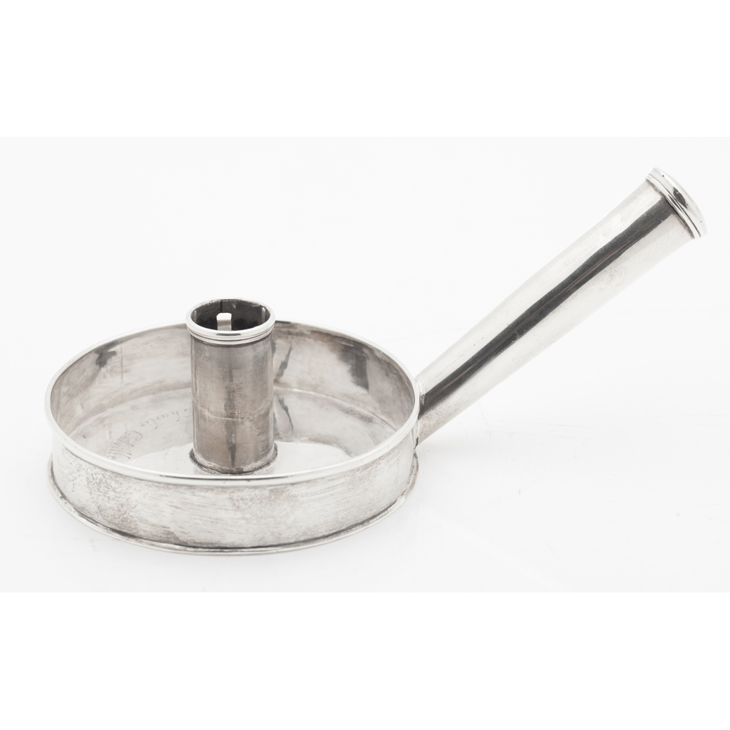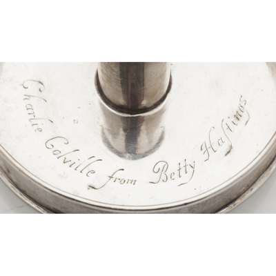 no apparent maker's mark, London 1832, of deep circular form, central sconce, with tapered large hollow handle, the flat engraved 'Charles Colville from Betty Hastings'