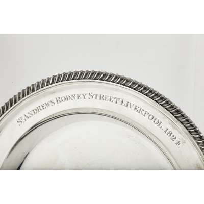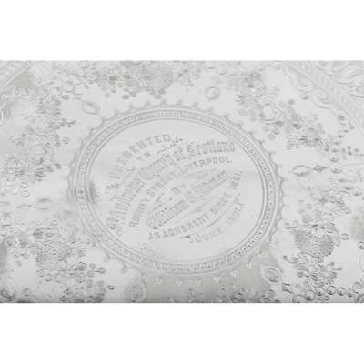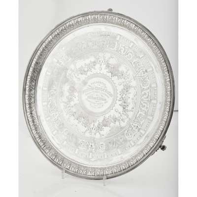 Walker & Hall, Sheffield 1899, of circular form, beaded border, heavily engraved detail to flat, inscribed Presented to St. Andrews Church of Scotland Rodney Street, by William Aitken and adherent since 1861 June 1901, raised on three ornate paw feet