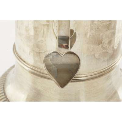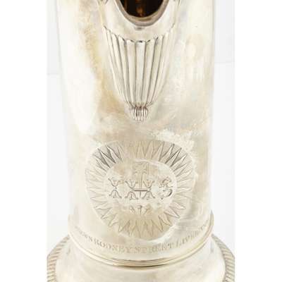 Rebecca Emes & Edward Barnard I, London 1824, of cylindrical form with stepped circular base and short spout, with large S scroll handle and hinged domed cover, the body inscribed with crest and St. Andrews Rodney Street Liverpool 1824