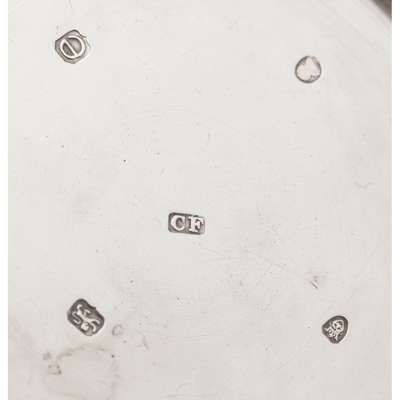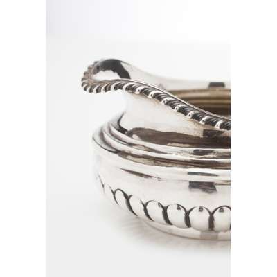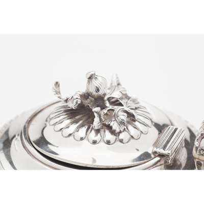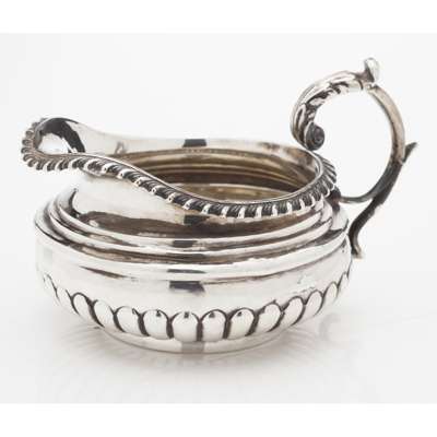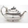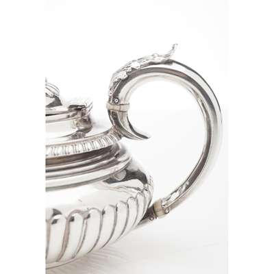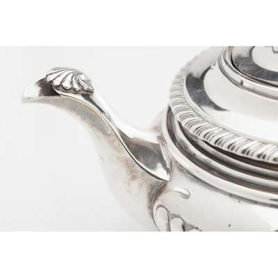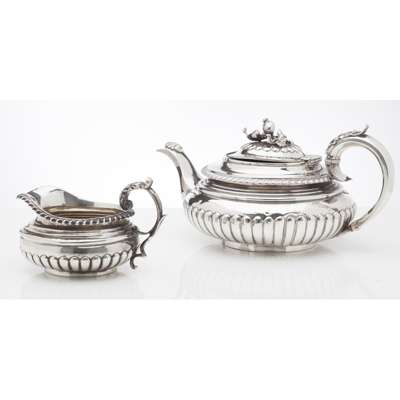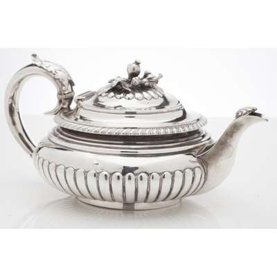Charles Fox, London 1820, both of squat circular form, semi-fluted, with gadrooned border, foliate detailing to handle and finial on teapot, crest and motto to front of both