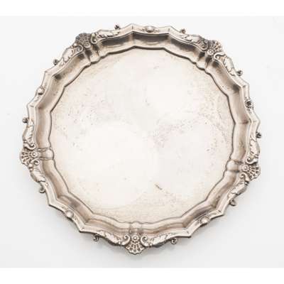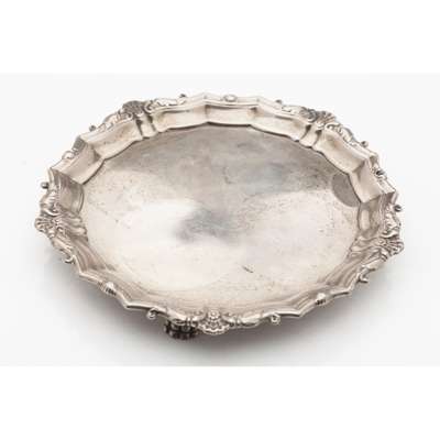 Sheffield, Thomas Blagden & Co 1814, of shaped circular form, with shell and scroll cast edge and moulded pie-crust border, raised on three paw feet, engraved presentation to underside