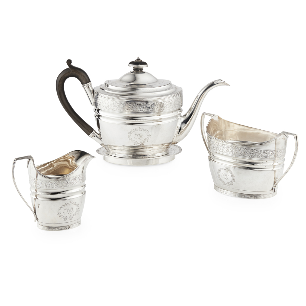 William & Patrick Cunningham, Edinburgh 1802, comprising; a teapot, milk jug, two handled sugar bowl and teapot stand, all of oval form, angular handles, Greek key border to base, swag detail and crest to front