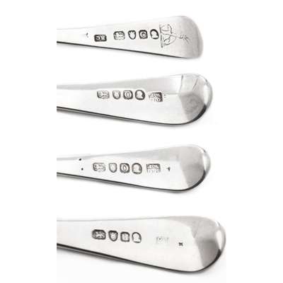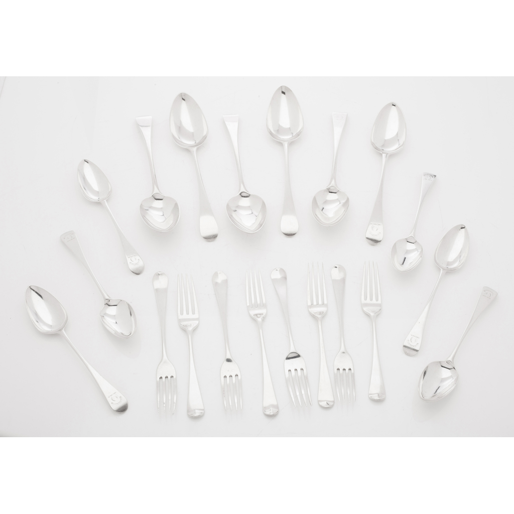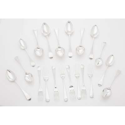 of Old English pattern, all London, to include; six table spoons London 1794, six dessert spoons, George Smith (III) & William Fearn, London 1789; and eight dessert forks, IB London 1793 (20)