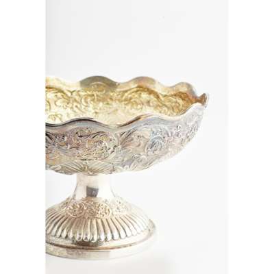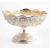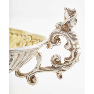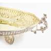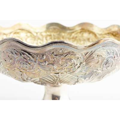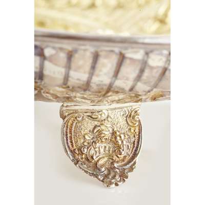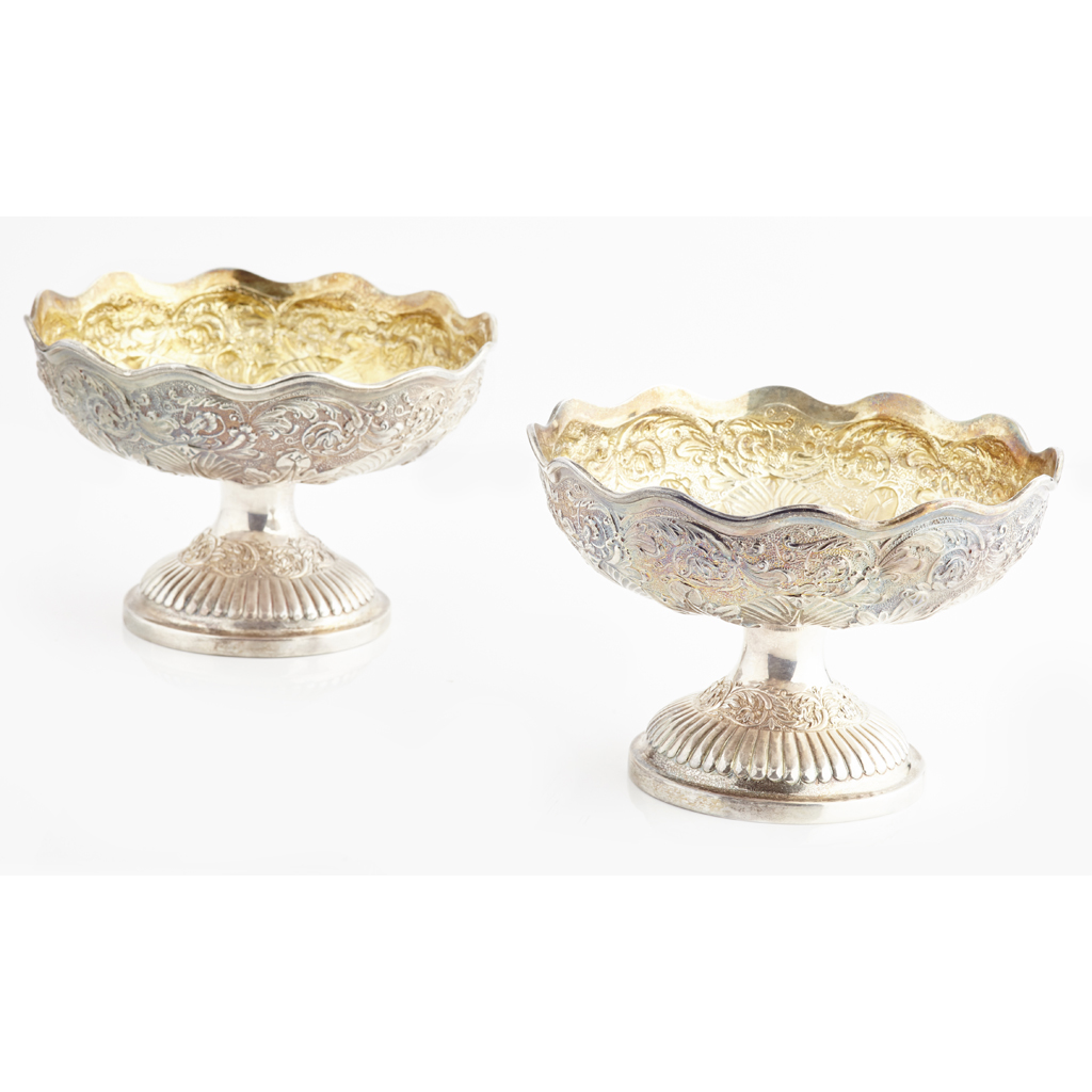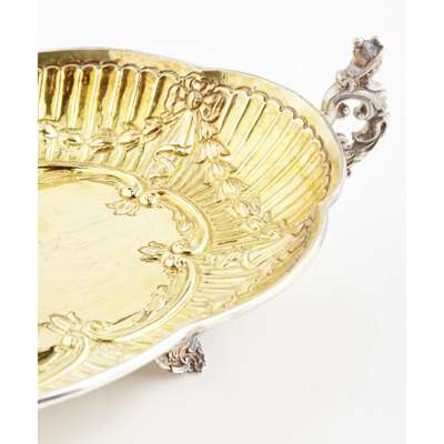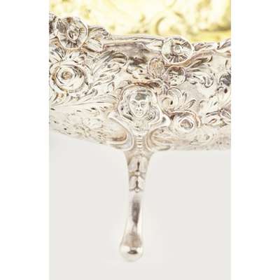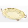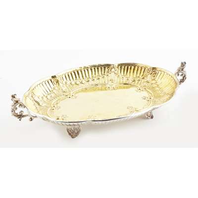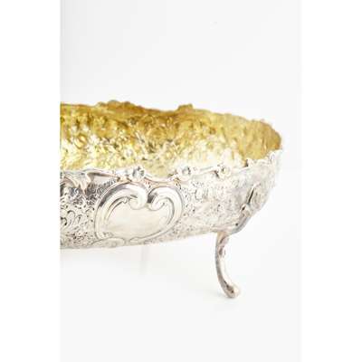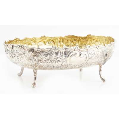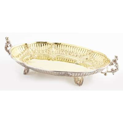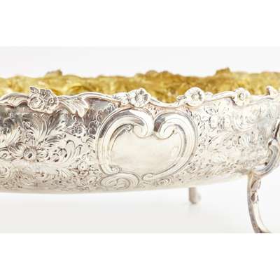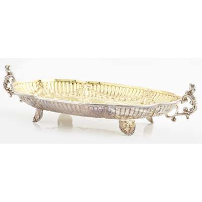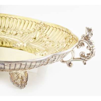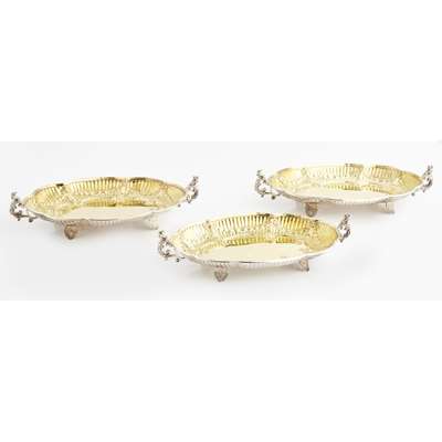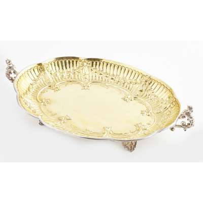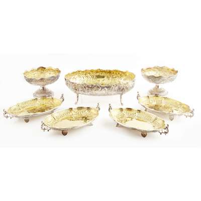 comprising a large oval dish raised on four plain legs; together with two tall comports, raised on a gadrooned domed stem, four oval dishes on four bracket feet with scalloped edge, gadroon to body with swag and bow detail and scroll handles all heavily embossed with floral and foliate detail, in a fitted case (7)