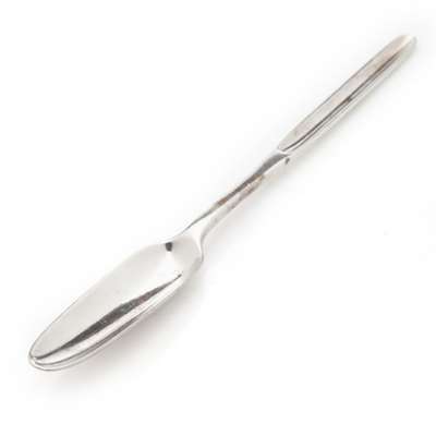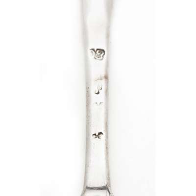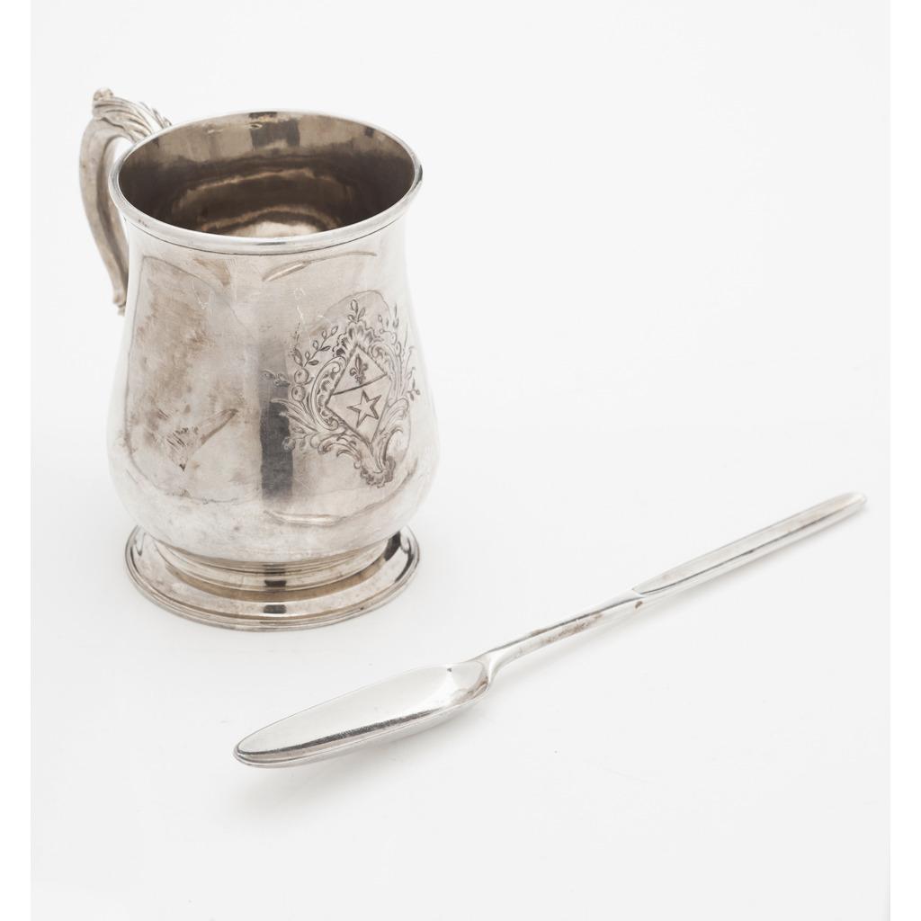 John Payne, 1762, of baluster form, engraved armorials, clasped scroll handle, splayed foot; together with a marrow scoop, indistinct marks, 18th century (2)