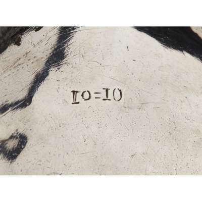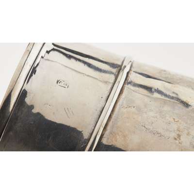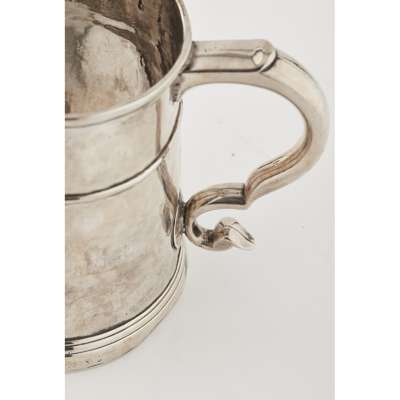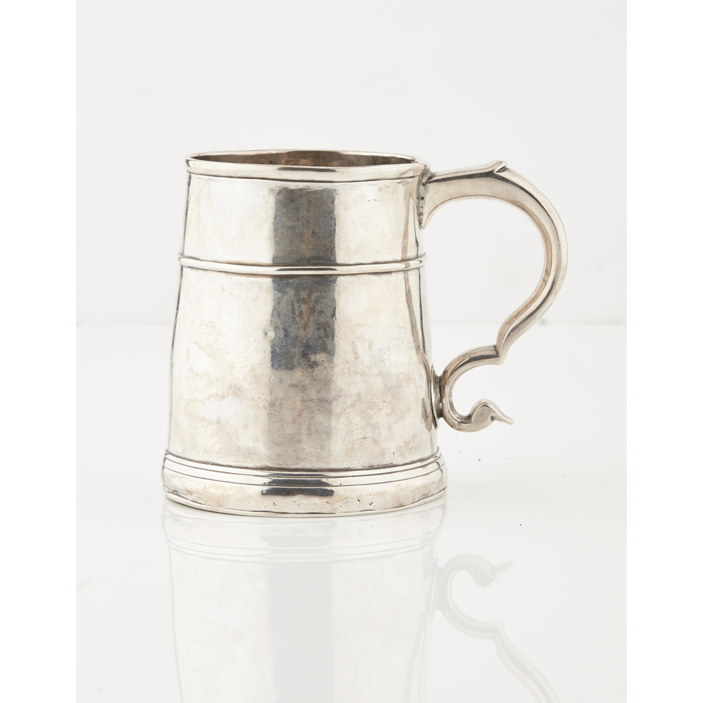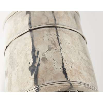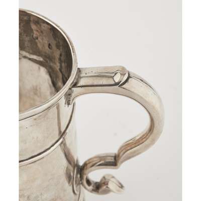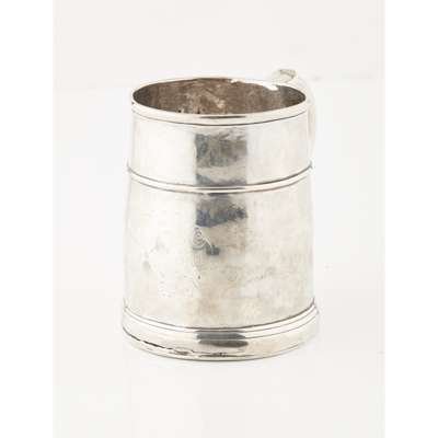indistinctly marked Dublin, possibly 1748, the flared cylindrical body with moulded rim and foot, engraved with armorial, with S scroll handle