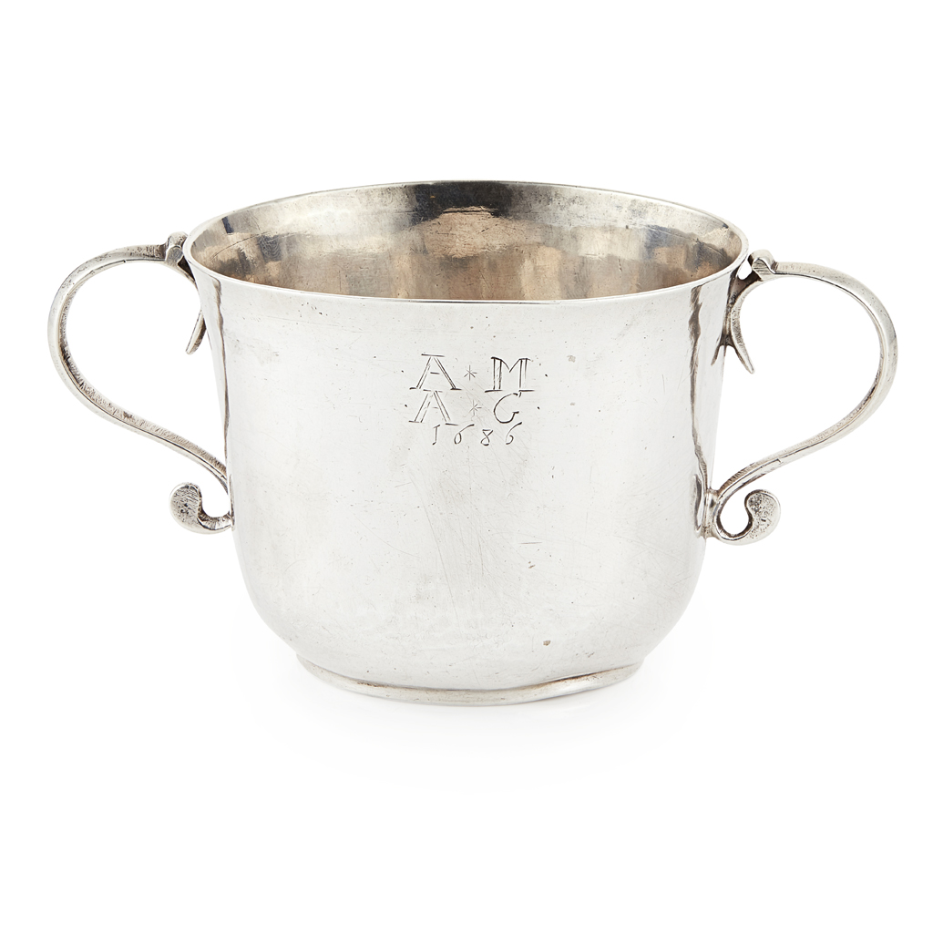 marked WC, of conventional form, deep body, scroll handles, simply engraved A*M A*C 1678 to front