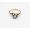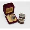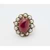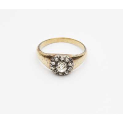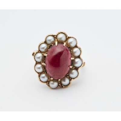 claw set with a large garnet cabochon, in a border of half pearls, to a plain shank stamped 9ct; together with a diamond set cluster ring, set with old European cut diamonds, to a plain unmarked shank (2)