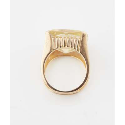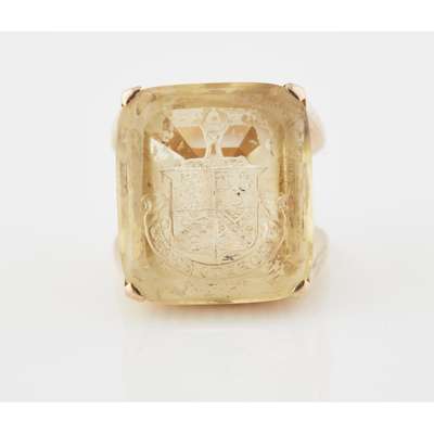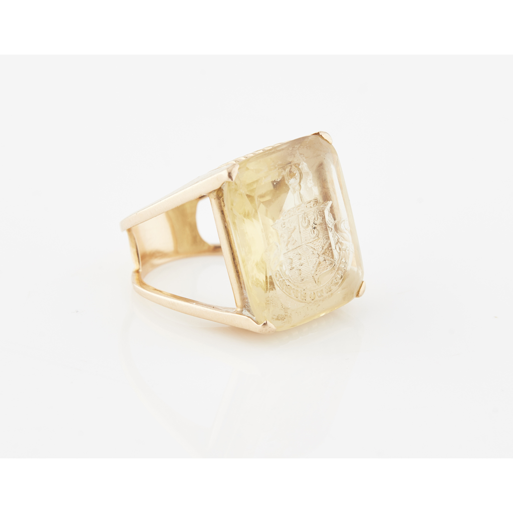 the claw set yellow citrine engraved with the Cathcart crest and motto, set in an unmarked yellow metal shank