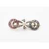 of interlocking stylised ribbon design, set throughout with small round cut rubies, sapphires and diamonds, with a central bouton pearl, unmarked