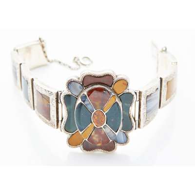 the central shaped panel set throughout with various agates, with hinged central locket compartment, to a tapering square agate set link bracelet, with concealed clasp