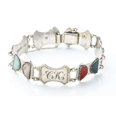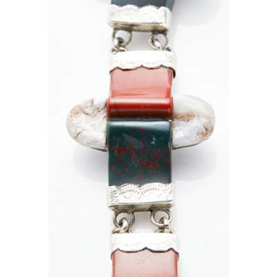 the first composed of rectangular lobed links, set throughout with various agates; the second composed of shaped rectangular silver links, set with two agates to each link, central link with engraved initials, WBS, Glasgow 1953 (2)
