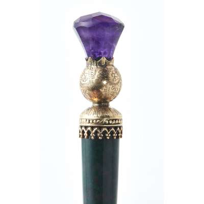 the terminal modelled as a thistle in yellow metal and facetted amethyst, atop a tapering green agate baton