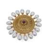 in the etruscan style, of circular outline, collet set with a ruby cabochon, the ground with wire work detail, in a outer border of oval shaped pearls, stamped GREECE 750, with Lalalounis mark