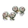 each circular terminal set with a floral cluster of moonstone cabochons and small ruby cabochons, in a green enamel border, links with indistinct continental marks