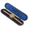 composed of a central scrolling plaque, set with two oval cut garnets and four seed pearls, to an integral flexible link bracelet with concealed clasp, apparently unmarked, in a fitted case