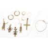 four examples, of various shapes and designs, set at intervals with various coloured stones, a 9ct gold engraved cross pendant, a 9ct gold wedding band and christening pendant; a broad diamond set band, stamped 18ct, various other pieces of unmarked yellow metal jewellery (qty)