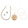 to include a tri-coloured link necklace, stamped 375; a pair of associated clip earrings, apparently unmarked; two bangles with bright cut detail, stamped 22A, a gilt metal pendant of African style (5)