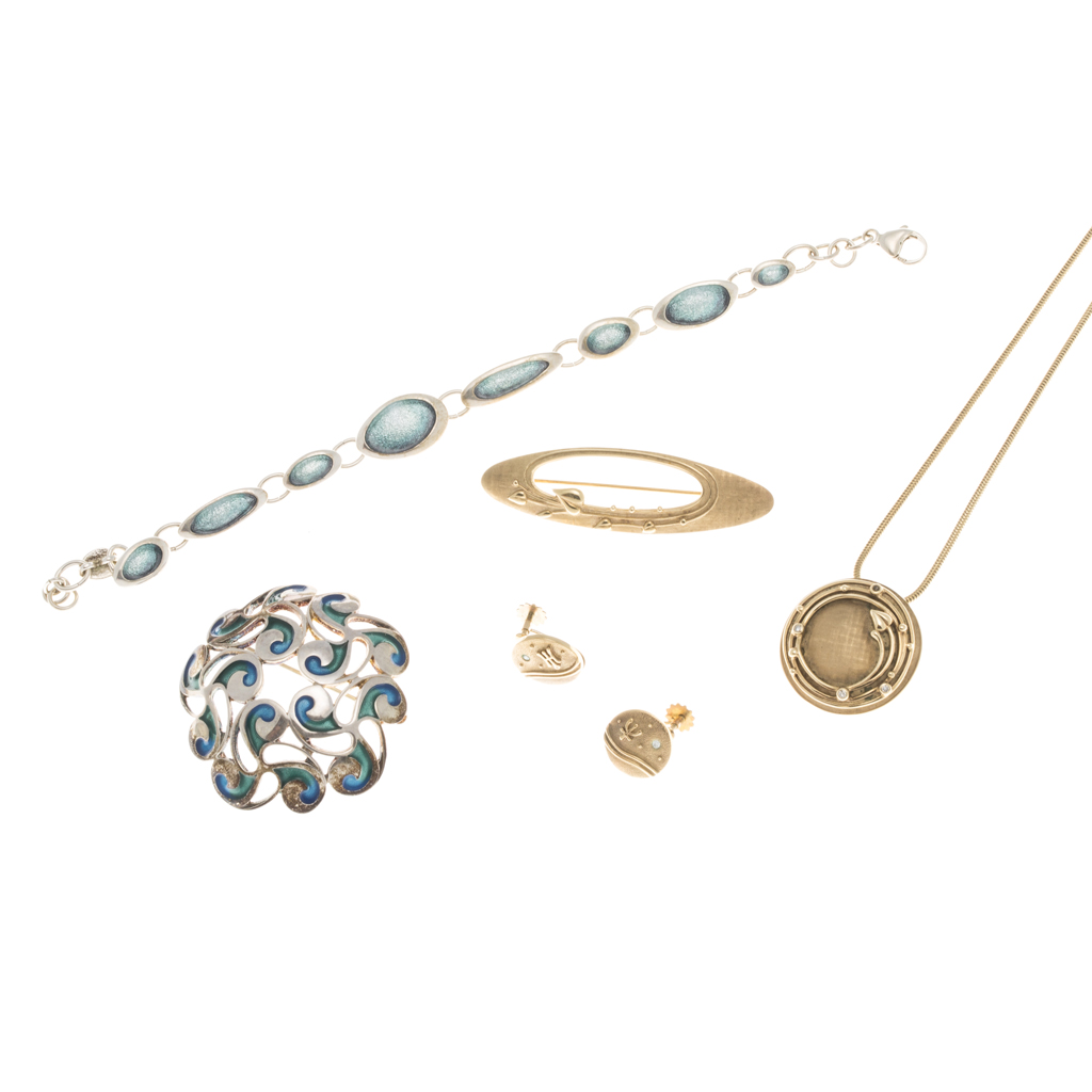 to include a silver brooch, of domed scrolling design with blue/green enamel detail; a circular 9ct gold pendant, with diamond set detail, to a snake link chain, a pair of 9ct gold earrings, each of circular outline, with Pisces symbol and small round cut aquamarine, screw fittings; a 9ct gold oval brooch with foliate detail; a silver and blue enamel bracelet (4)