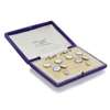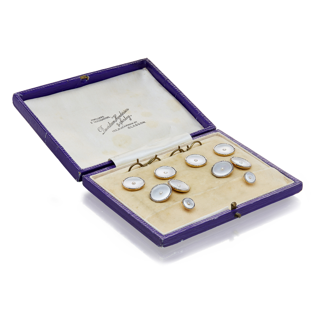 comprising four buttons, two studs and a pair of cufflinks, each round terminal set with a small seed pearl to a mother of pearl ground, each stamped 9ct & 18ct, in a fitted box by Davidson, Henderson & Sorley … Glasgow