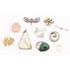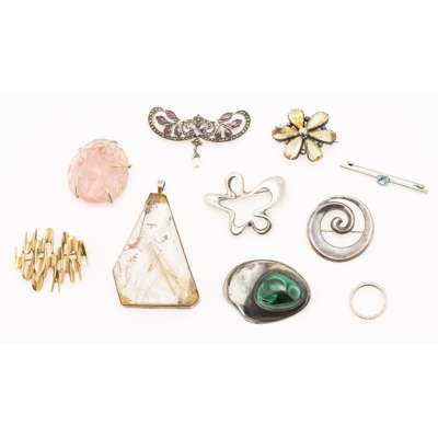 to include a large rutilated quartz pendant, a citrine set floral brooch, a diamond set eternity ring; a carved rose quartz pendant, a Georg Jensen silver brooch, a modernist 9ct gold brooch; a zircon set bar brooch and various others (10)