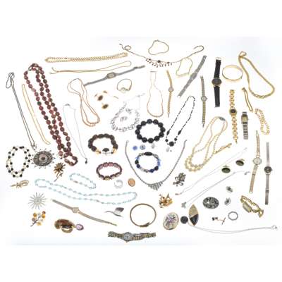 to include a single strand of black and white cultured Jersey pearls with matching earrings, a sapphire and pearl necklace; a large selection of wrist watches, a collection of beaded necklaces and faux pearls; various other brooches, chains, necklaces and earrings (qty)