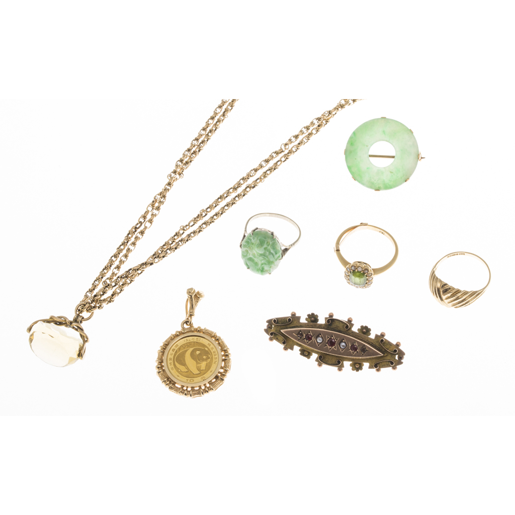 to include a 9ct gold ring with ribbed detail, a Victorian 9ct gold ruby and seed pearl set brooch; a fancy link necklace with citrine fob, a 1983 10th panda in detachable mount; a green tourmaline and seed pearl set cluster ring, stamped 18; a carved jade panel ring, to a plain unmarked mount; a plain polished jade bi-disc brooch, unmarked mounts (qty)