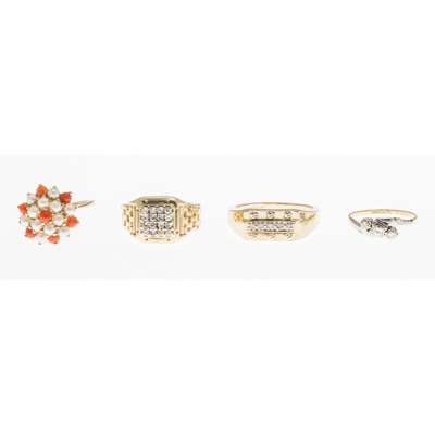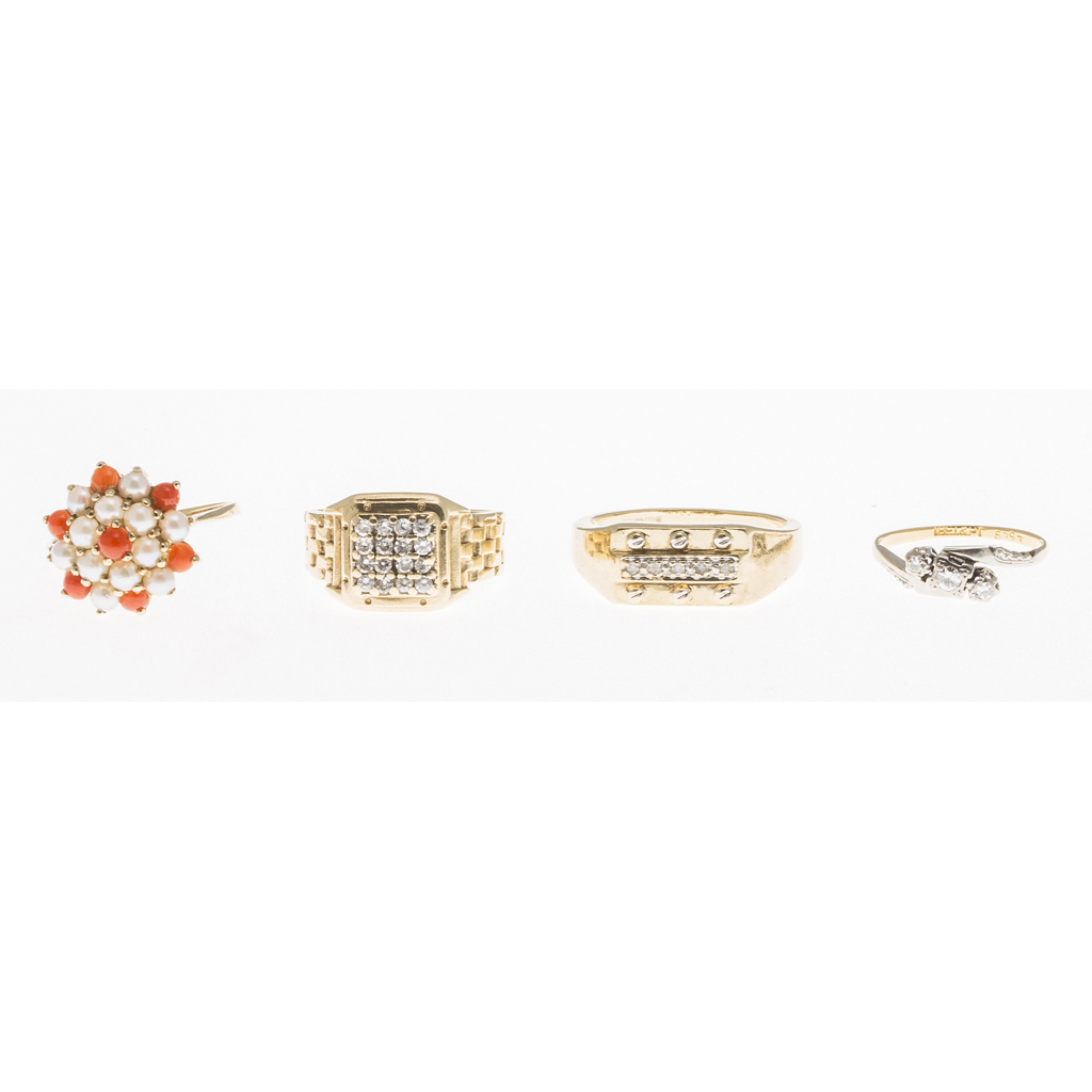 to include a three stone diamond ring, stamped 18CT & PLAT; a 9ct gold seed pearl and coral set cluster ring; a gentleman's 9ct textured gold, diamond set panel ring; a gentleman's 9ct gold five stone diamond ring (4)