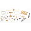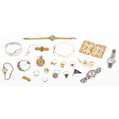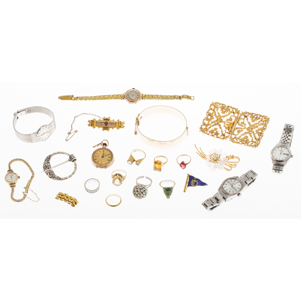 to include a 9ct gold cased fob watch, a Victorian 9ct gold garnet and pearl set brooch, a silver gilt belt buckle, a 9ct gold flag brooch, a gilt bangle, a lady's Omega wrist watch, various other wrist watches; various gem set rings and brooches (qty)
