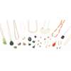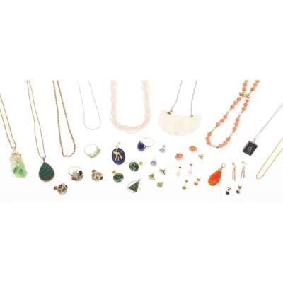to include a coral and cultured pearl set necklace, a pair of coral set stud earrings; a carved jade pendant, mount stamped 14k, to a rope twist chain; a malachite set pendant, a seven row cultured pearl necklace; a jade set ring stamped 14k, a pair of associated ear studs; various other hardstone and jade set pendants, earrings and rings (qty)