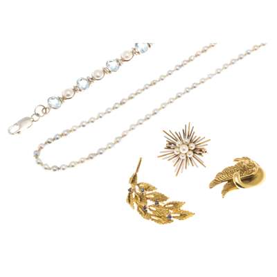 a single strand of slightly graduated cultured silver pearls, to a 9ct gold clasp; a 9ct bi-coloured brooch with central cluster of cultured pearls; an aquamarine and cultured pearl set bracelet, stamped 925; an 18ct gold sapphire set brooch and an 18ct gold swan pendant (5)