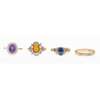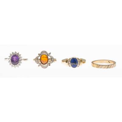 to include an amethyst and diamond set cluster ring, to a plain unmarked white metal shank; a 9ct gold diamond and lapis lazuli set ring; an amber and diamond set cluster ring, to plain shank, stamped 925; a 9ct gold wedding band, with engraved detail (4)