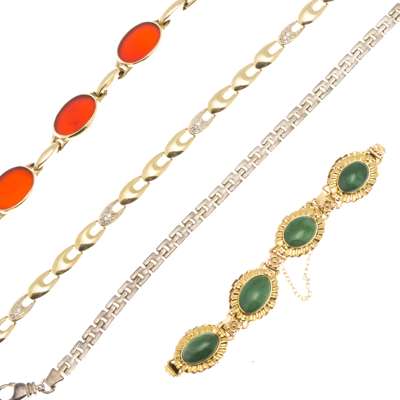 to include a 9ct gold cornelian set bracelet, with fold over clasp; a 14ct gold jade set bracelet, box clasp and safety chain; a 9ct gold bracelet, with intermitting diamond set panels; an unmarked white metal bracelet (4)