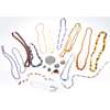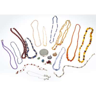 to include a single strand of amethyst beads, to a 9ct gold clasp; a coral bead set necklace, a lapis lazuli and seed pearl set necklace; a turquoise set brooch; a chunky lapis lazuli and silver set necklace, two Baccarat glass pendants, various beaded necklaces and a compact mirror