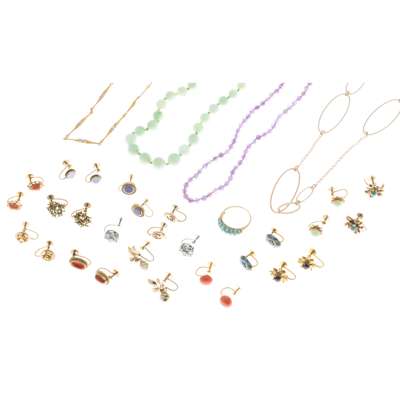 to include a single strand of amethyst beads, a stand of slightly graduated jade beads, a contemporary textured link necklace, stamped 585; a 9ct gold oval link necklace; fourteen pairs of gem set earrings and a 9ct gold turquoise set bomb ring (qty)