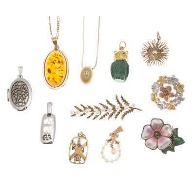 to include a tri-coloured floral brooch, pin stamped 925; a David Anderson enamelled floral brooch, stamped NORWAY STERLING 925S; a 9ct gold and malachite owl pendant, a 9ct gold sun-burst pendant, a 9ct gold and seed pearl pendant; a 9ct gold and seed pearl set brooch, by Cairncross of Perth; five further pendants and chains (qty)
