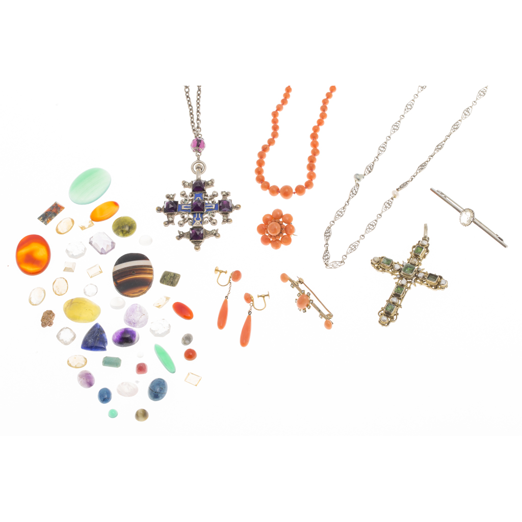 to include a coral necklace, two coral brooches and a pair of coral pendant earring; two enamel and gem set crosses; a colourless gem set bar brooch; a selection of loose gemstones, a filigree neck chain (qty)
