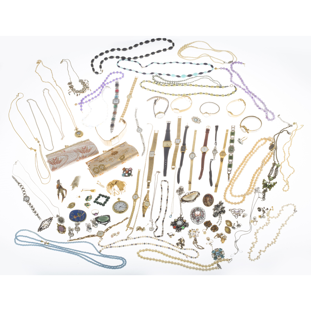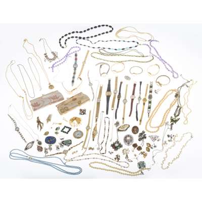 to include various beaded necklaces, gem set brooches and rings, faux pearls, bracelets, wrist watches etc (qty)